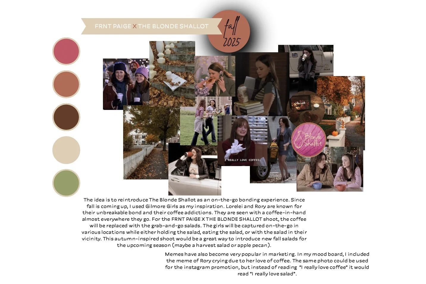 Marketing Campaigns! Real Estate Marketing Campaign I created a flyer, a brochure, and a social media post to advertise the sale of The Biltmore Estate. Brand Collaborations! COLOURPOP X HANNAH MONTANA Two Chicks X Love Island Mood Boards! I created a mood board for a social media campaign for the brand The Blonde Shallot inspired by the show Gilmore Girls.